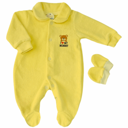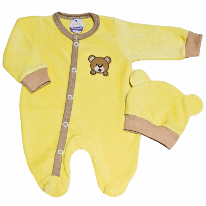Kit Macacão Prematuro Plush Bordado Gorro Amarelo
