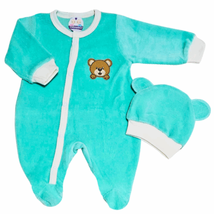 Kit Macacão Prematuro Plush Bordado Gorro Verde