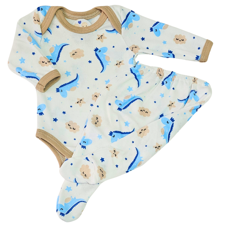 O body, disponível em manga longa, vem com botões entre as perninhas, a calça vem com pé fechado protegendo o pezinho do seu bebê.