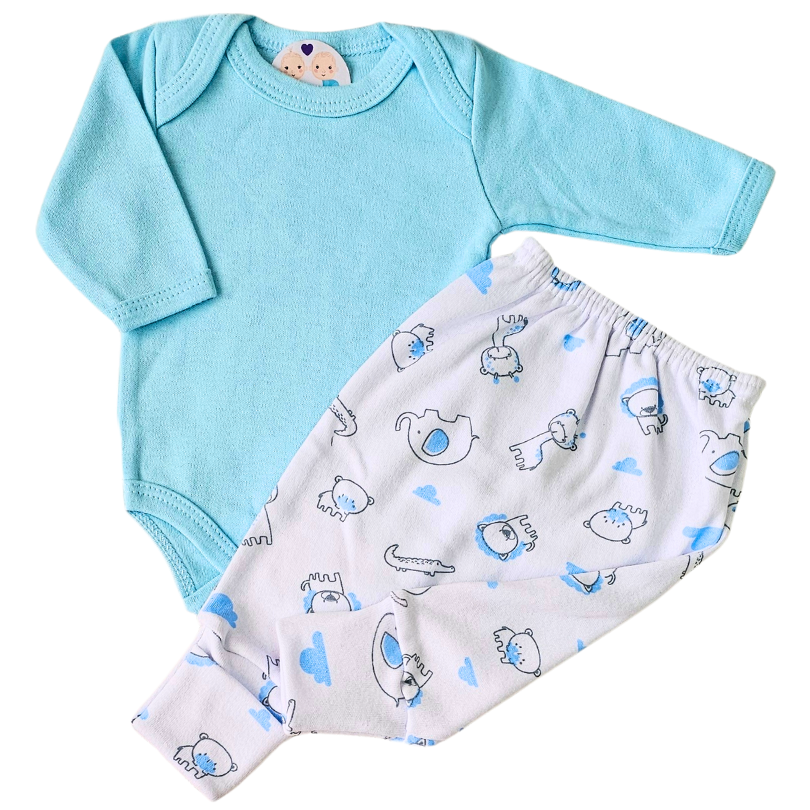 O kit é composto por body manga longa liso e calça estampada, super confortável, feito em suedine 100% algodão.