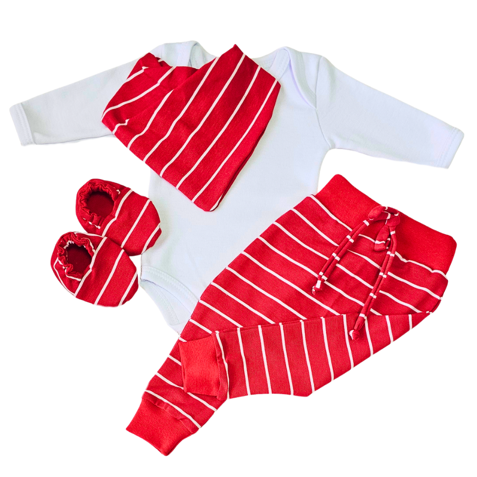 Perfeito para todas as nossas estações, nosso kit em algodão macio, é composto por saruel, sapatinho, bandana e body em suedine 100% algodão.