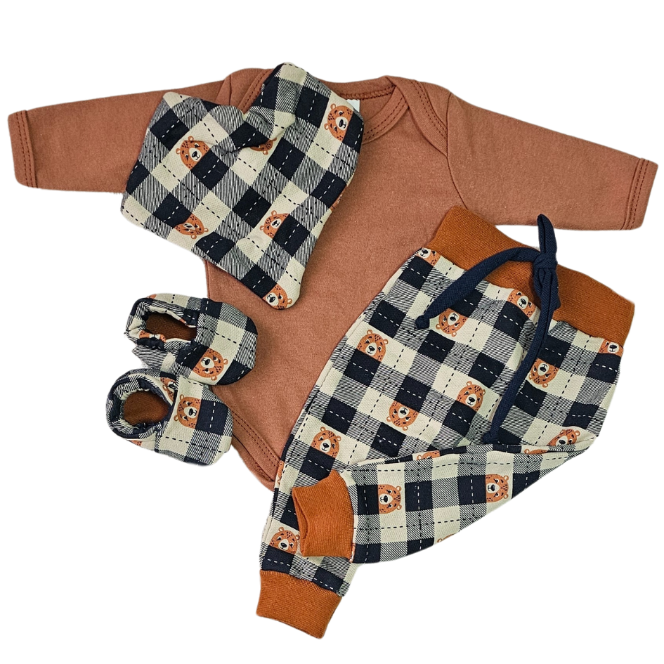 Perfeito para todas as nossas estações, nosso kit em malha de moletom macio, é composto por saruel, sapatinho, bandana e body em suedine 100% algodão.