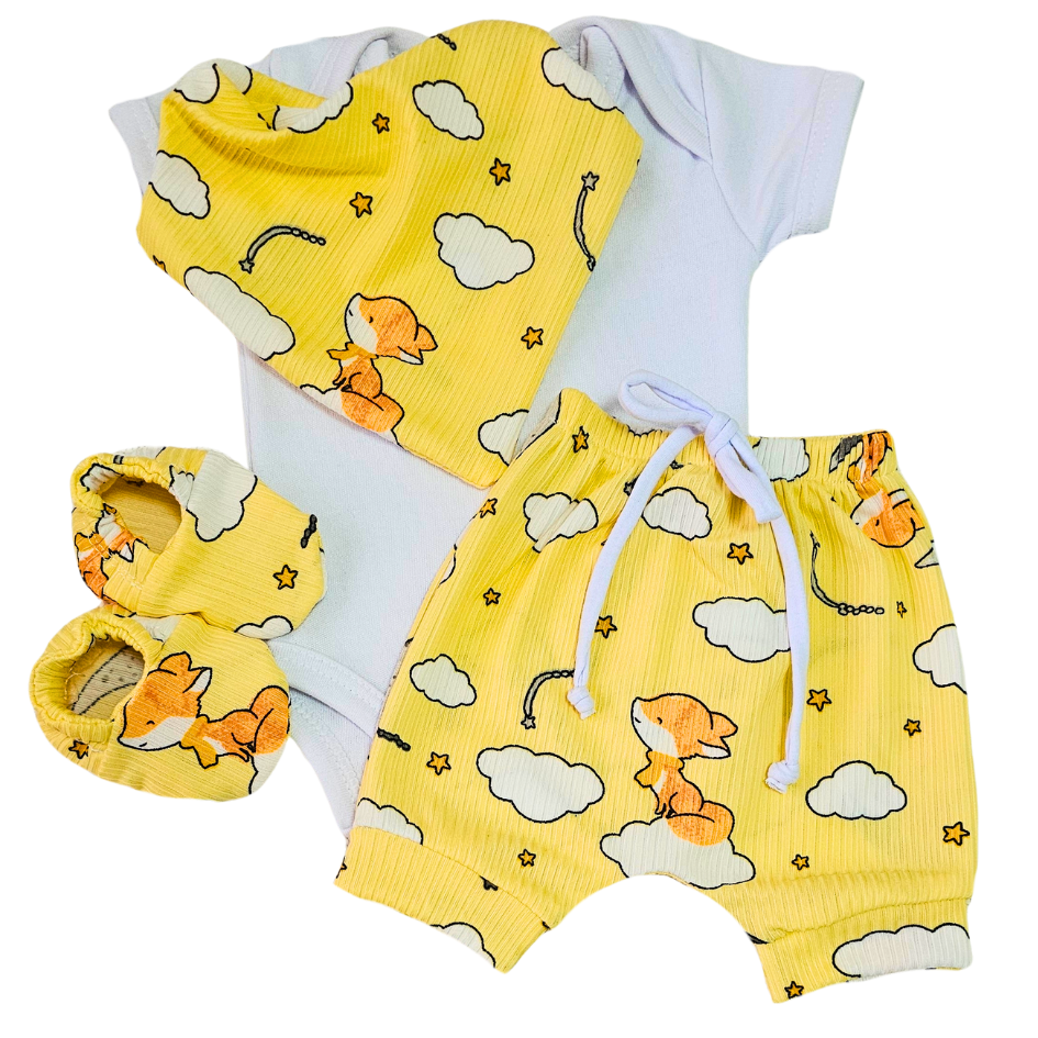 Kit composto por shorts, sapatinho, bandana e body manga curta.