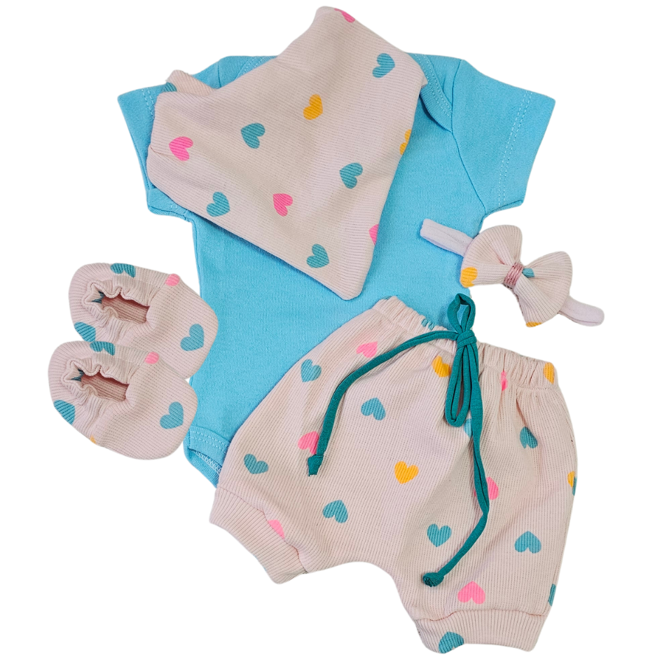 Kit composto por shorts, sapatinho, bandana, faixinha de cabelo e body manga curta.