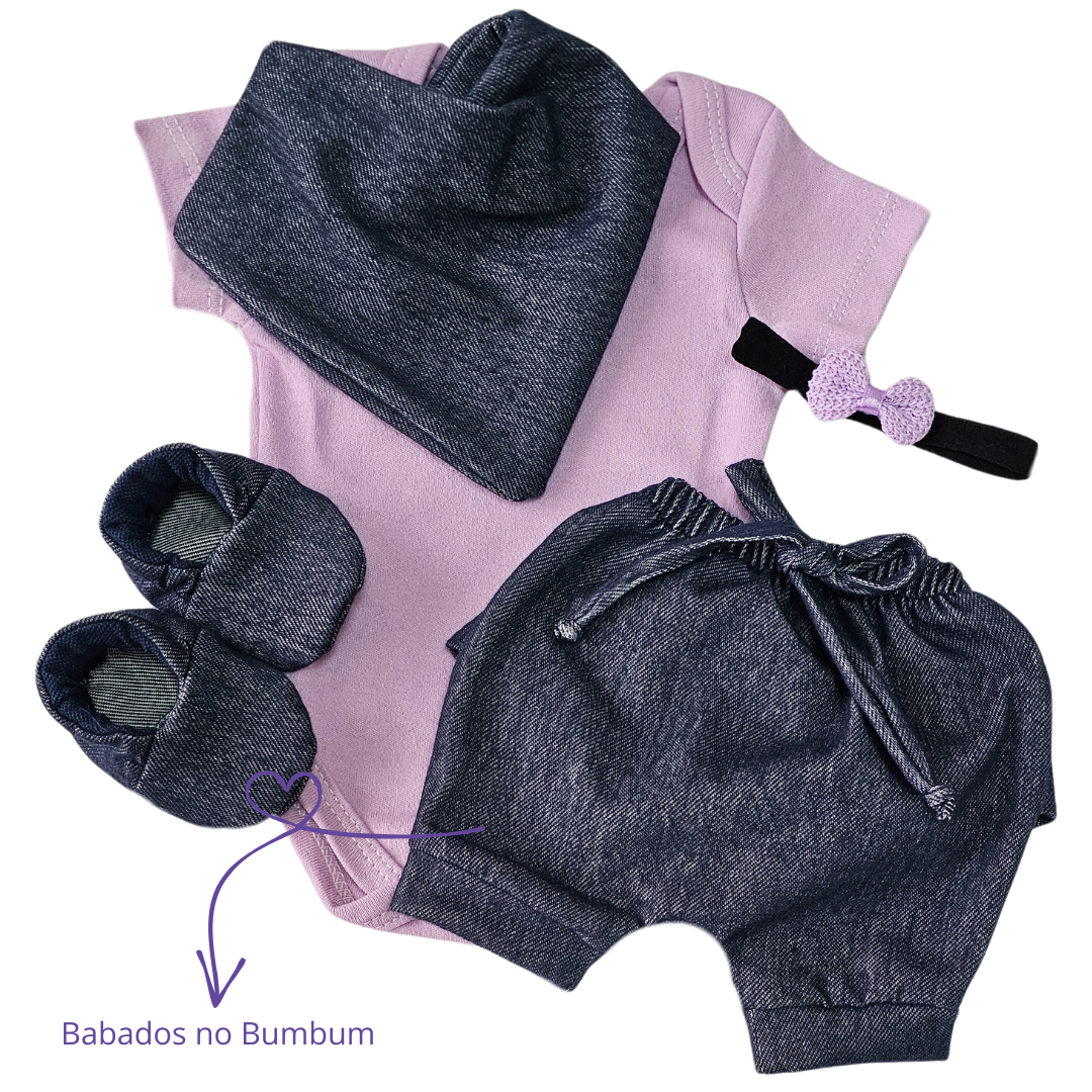 Kit composto por shorts, sapatinho, bandana e body manga curta. Acompanha um lacinho de cabelo.