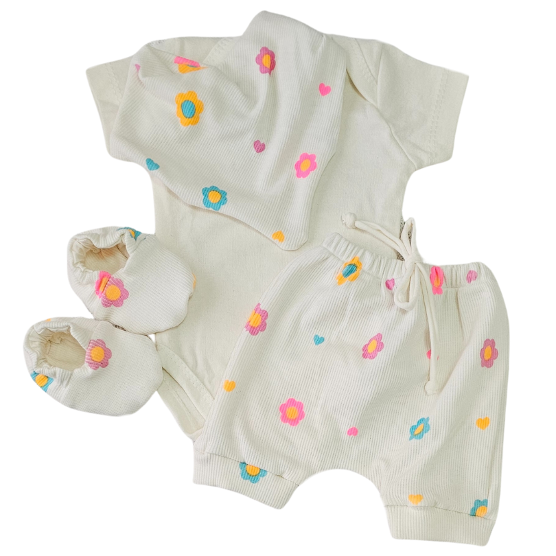 Kit composto por shorts, sapatinho, bandana e body manga curta.