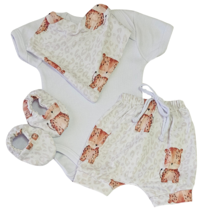 Kit composto por shorts, sapatinhos, bandana e body manga curta.