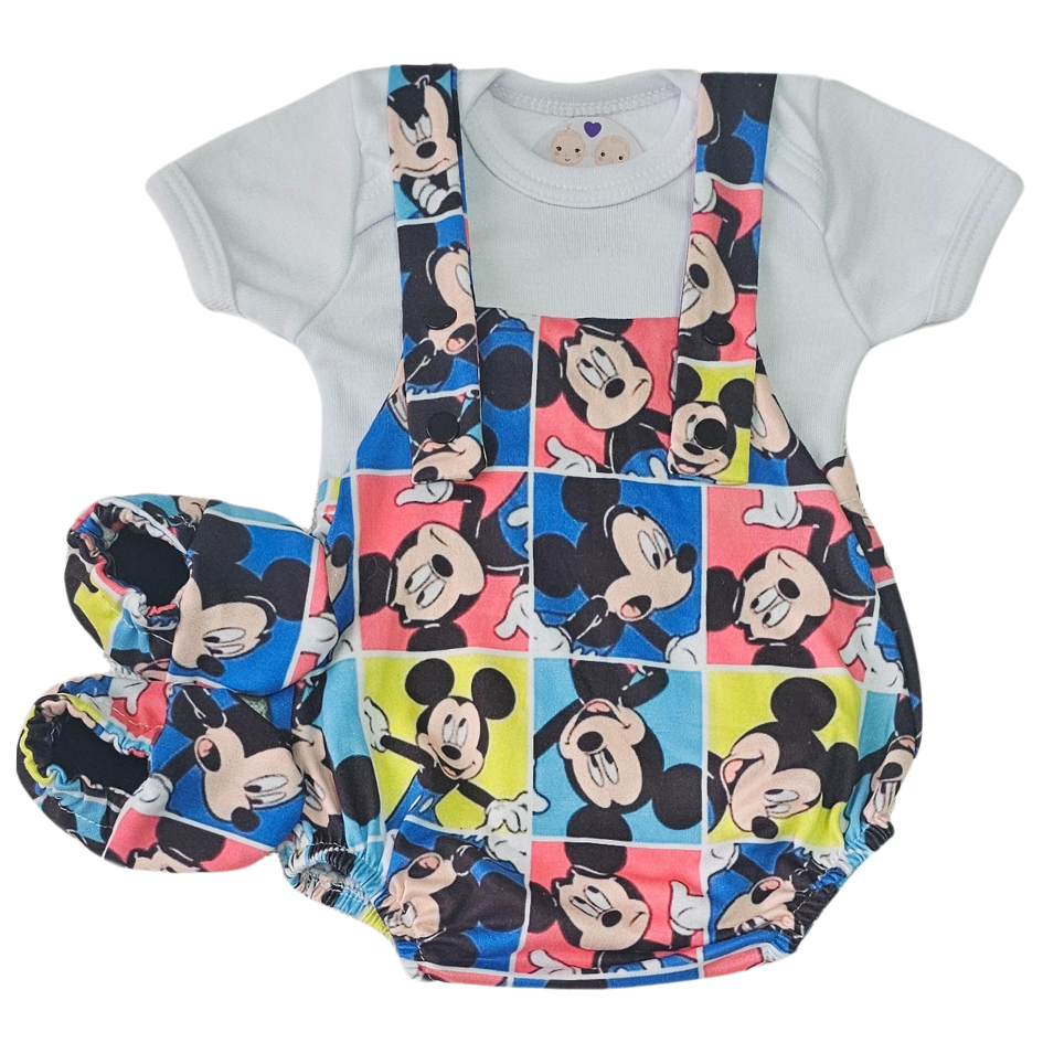Com uma modelagem moderna, em tecido 100% algodão, a peça vem coordenada com sapatinhos e body em suedine.