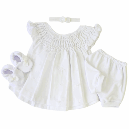 Com uma modelagem moderna, em malha de algodão super macia, imitando jeans, a peça vem coordenada com sapatinhos, lacinho e body em suedine.
