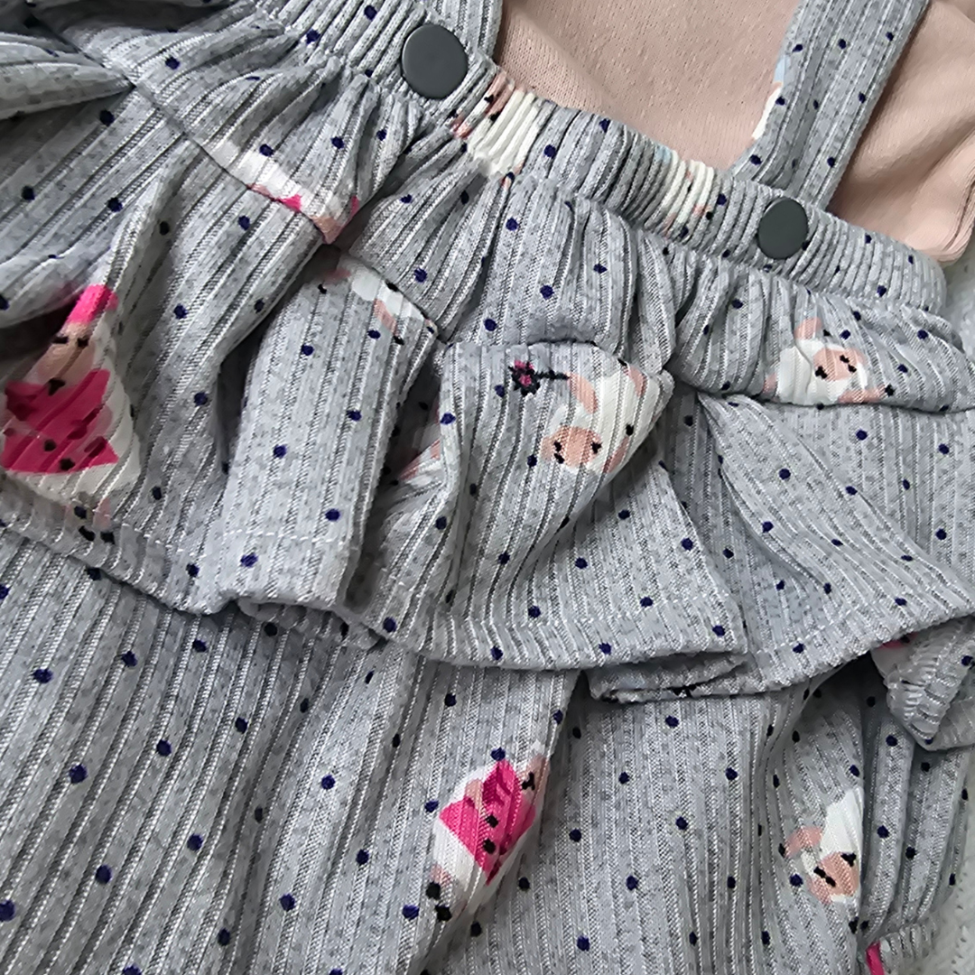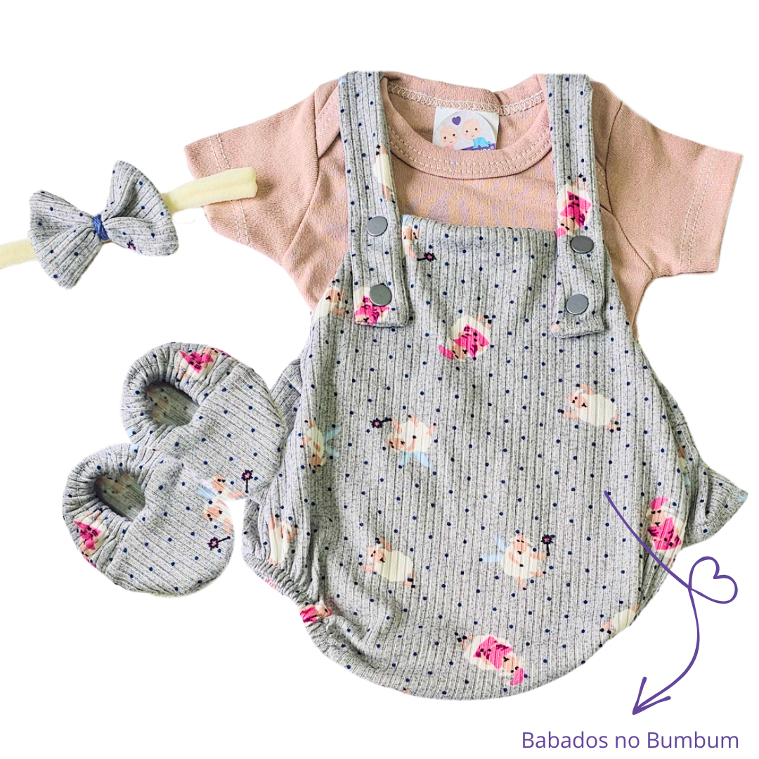 Com uma modelagem moderna, em malha de algodão, a peça vem coordenada com sapatinhos, faixinha de cabelo e body em suedine.