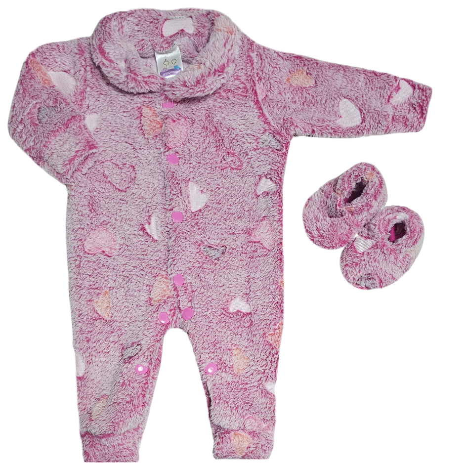 O kit vem com macacão e sapatinhos, todo em tecido fleece, simplesmente perfeito para os dias mais geladinhos do nosso inverno.