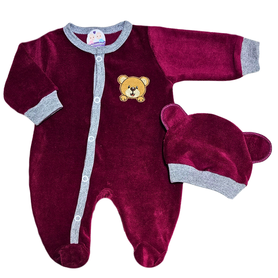 Kit Macacão Prematuro Plush Bordado Gorro Marsala