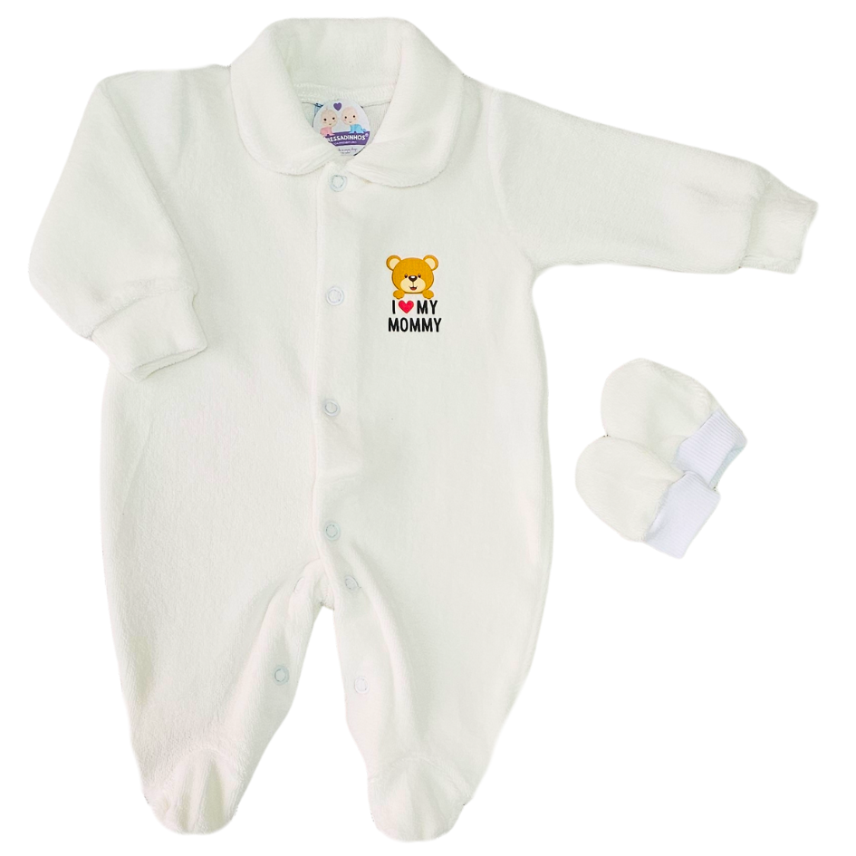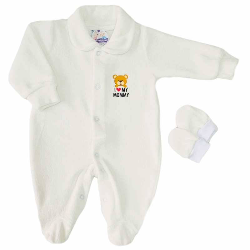 O macacão, vem luvinhas e com pezinho fechado, mantendo o bebê mais quentinho.