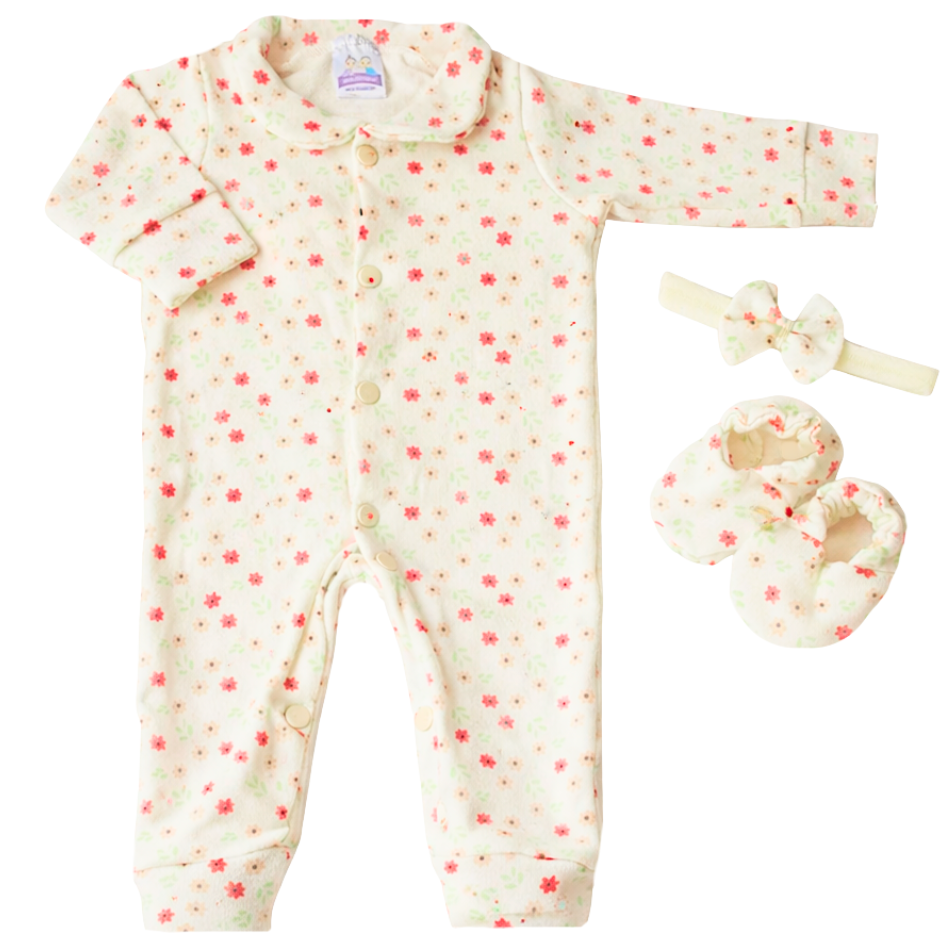 Nosso kit maternidade, em suedine 100% algodão, vem com macacão, faixinha de cabelo e sapatinho.