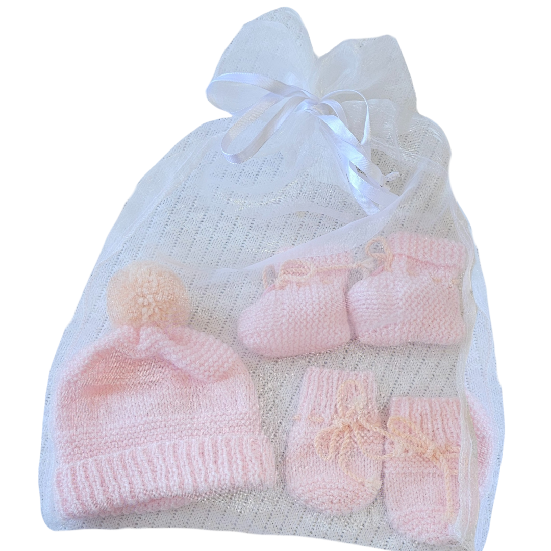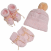 Nosso kit em tricot vem com gorrinho, luvas e sapatinhos, todos feitos à mão com muito amor em cada ponto.