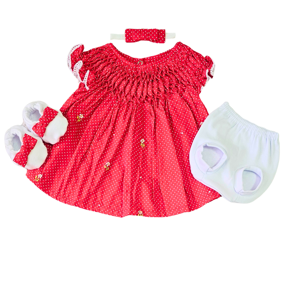 Kit Vestido Prematuro Casinha de Abelha Poá Vermelho