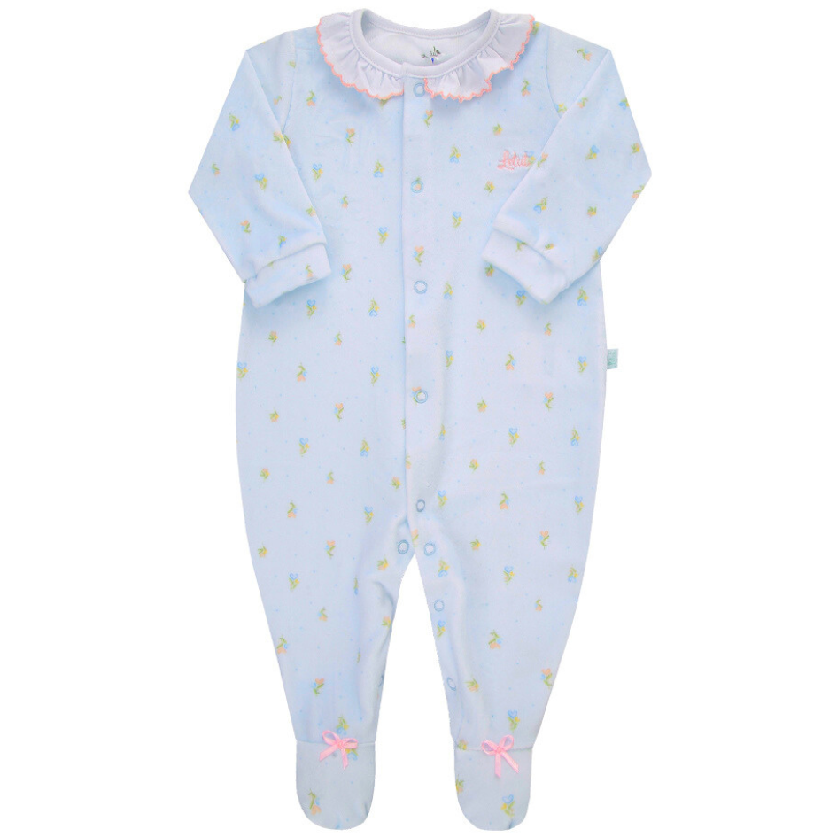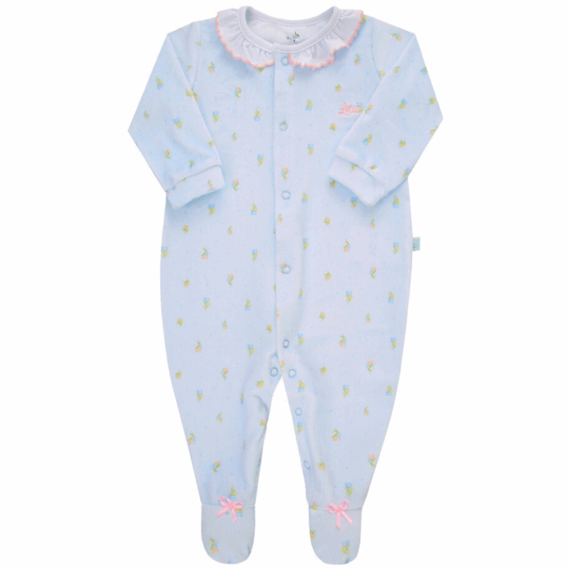 Os detalhes da estampa suave, da golinha bordada e lacinho nos pés, são super delicados, assim como sua pequena bebê, detalhes que dão um charme todo especial a roupinha.