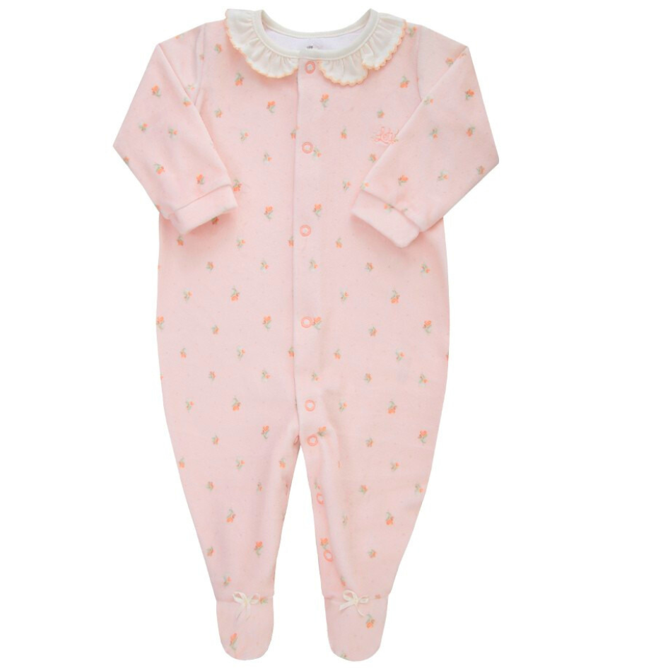 Os detalhes da estampa suave, da golinha bordada e lacinho nos pés, são super delicados, assim como sua pequena bebê, detalhes que dão um charme todo especial a roupinha.