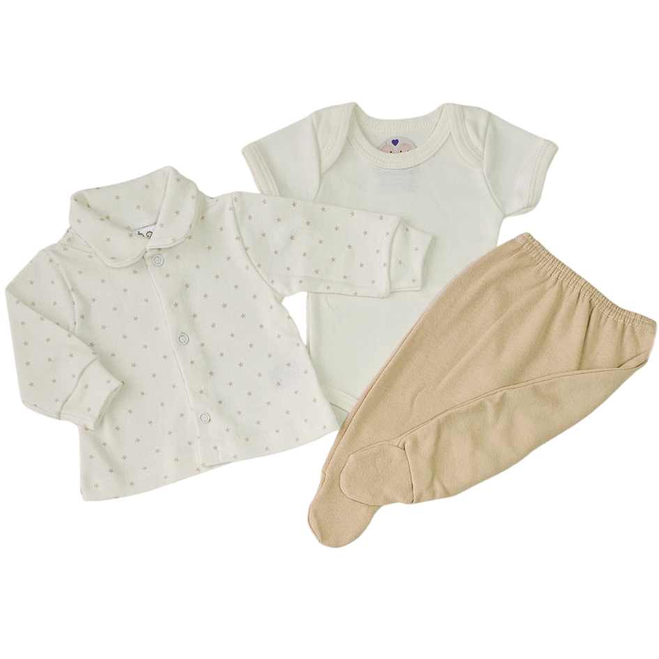 O kit inclui casaquinho com botões de pressão, body de manga curta e calça colorida com pé fechado.